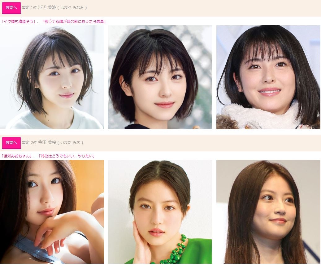 対面座位なら、浜辺美波とセックスしたい人が、今田美桜とセックスしたい人や、新垣結衣とセックスしたい人、より多い 4.ヤリたい芸能人投票 X Facebook はてブ LINE Pinterest コピー 2024.06.27 「対面座位で顔を見て生セックスしたい芸能人」の投票はコチラ 暫定 1位 浜辺美波 確かに、自分のチンチンを挿入してて、目の前で、この清楚な顔の子が喘いでると、見てるだけで射精しそう。