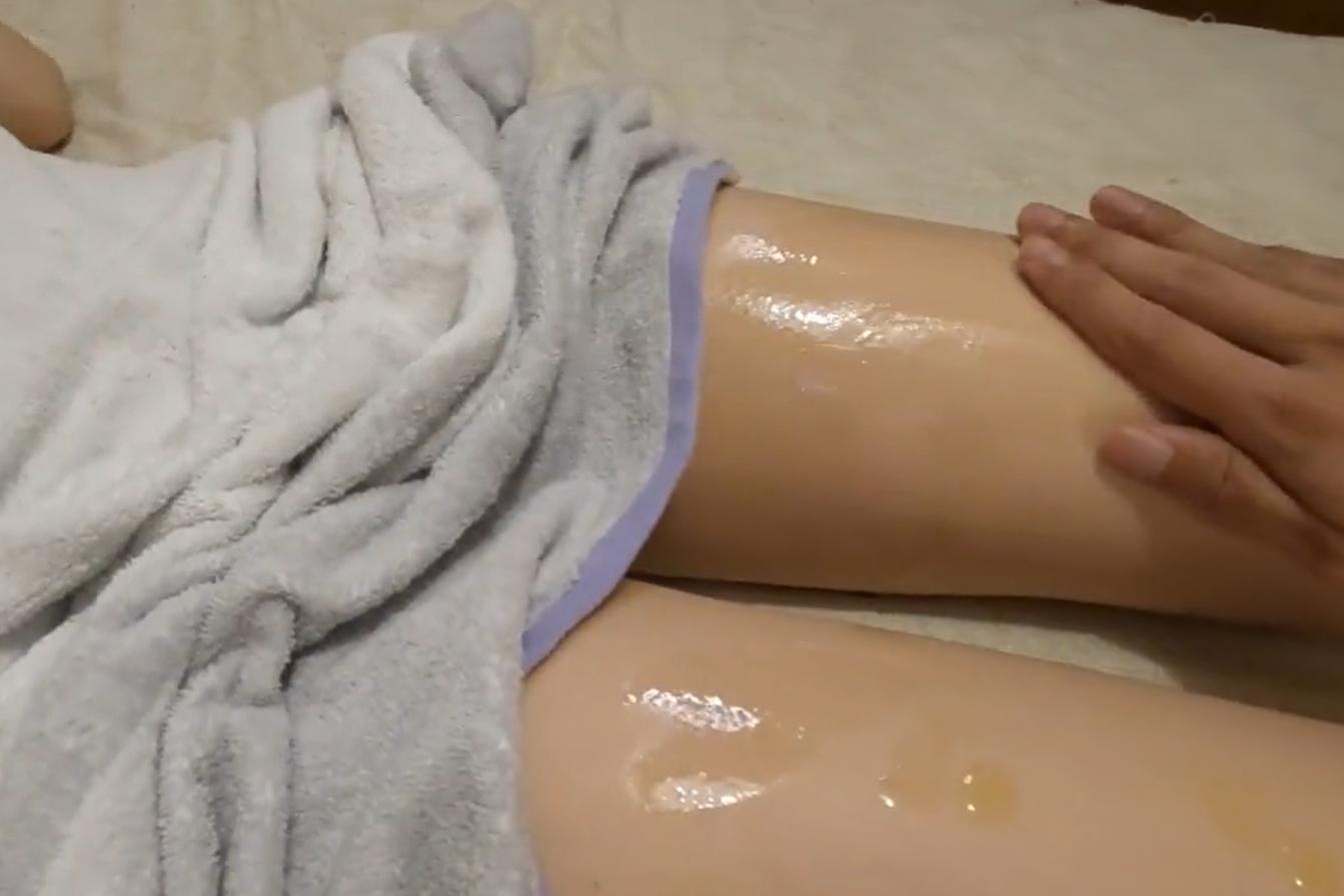 マッサージしていく順番も重要。 まずは仰向けで足から、マッサージオイルを垂らしてから、のばしながらマッサージ。 たまに、あそこの”きわ”に触れてみる。